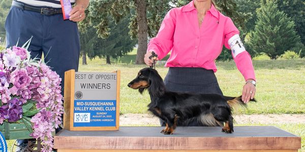 Lily is a black and cream long hair. She is AKC & UKC registered. She has produced black & tan, black & cream, chocolate & tan, chocolate & cream, and a cream puppy from previous litters. She passes on a super sweet disposition, great prey drive, and make super family pets. She has all of her OFA health clearances.